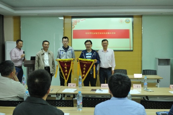 (资产管理处、保卫处综治办相关负责人为材料学院实验室安全先进单位授旗)