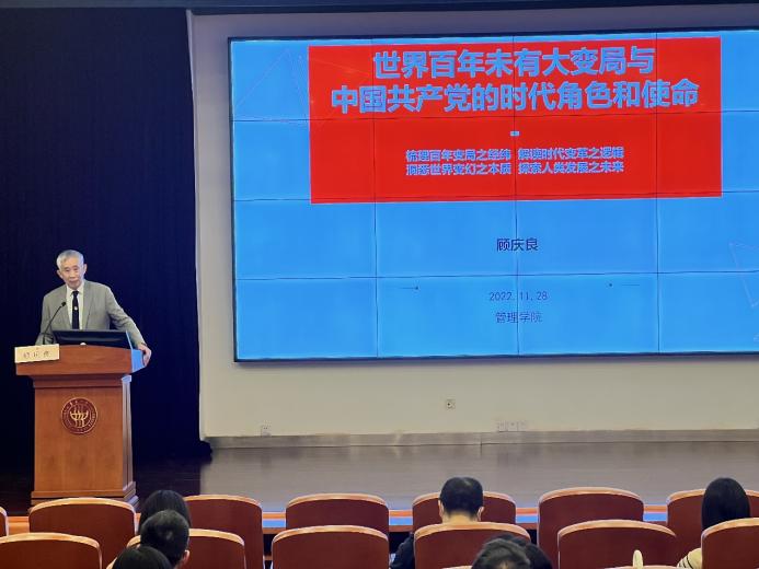 顾庆良以“世界百年未有之大变局和中国共产党的时代使命”为题,紧密结合党的二十大报告中对于世界局势和中国共产党的使命的研判和论述以及经济管理领域的经典理论,从“世界之变:世界百年未有之大变局”“世界之问:处在十字路口的世界与中国”以及“世界未来的中国方案和智慧:党的二十大——共产党的时代职责和历史使命”三大方面作了精彩报告,从战略高度和长远角度阐述了中国共产党在这个世界百年未有之大变局的时代所肩负的时代职责和历史使命,对于广大教工员工进一步学深悟透党的二十大精神,落实立德树人根本任务,担负好为党育人、为国育才的使命有现实指导作用。